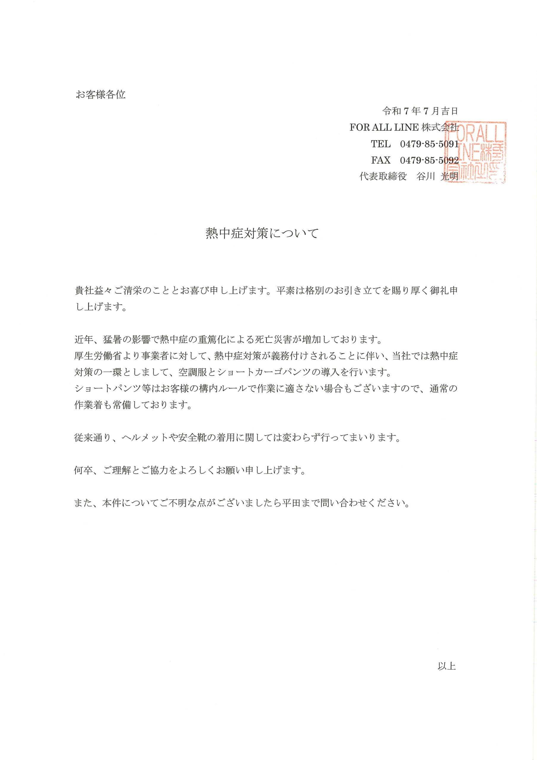 厚生労働省より事業者に対して熱中症対策が義務付けられることに伴い当社では対策の一環として空調服とショートパンツの導入を行いました。